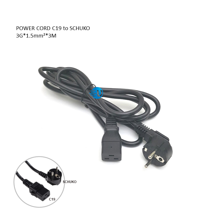 Power Cord C19 to Schuko Type Connector : IEC C19 (Female) & Schuko (Male) Cable Length : 3 Meter Cable Size : 3 x 1.5mm Rating Voltage : 220 250VAC 50/60Hz Rating Current : 16A